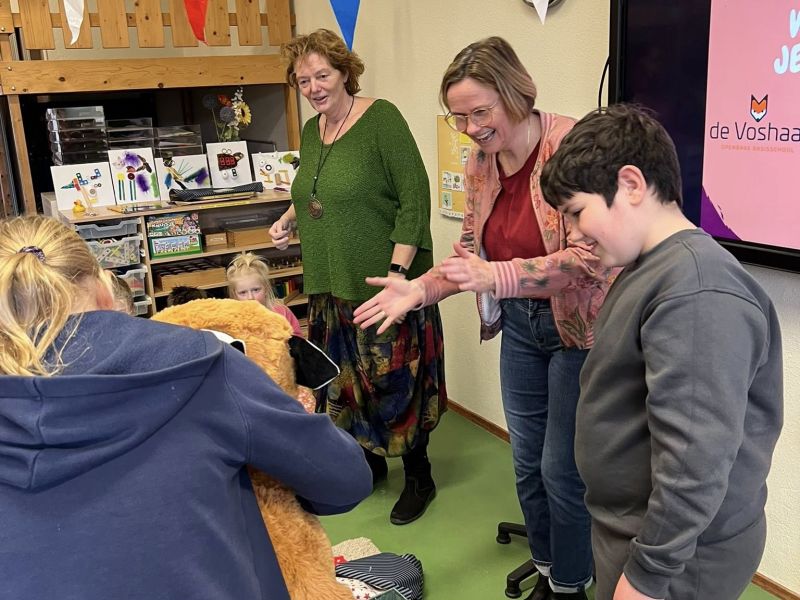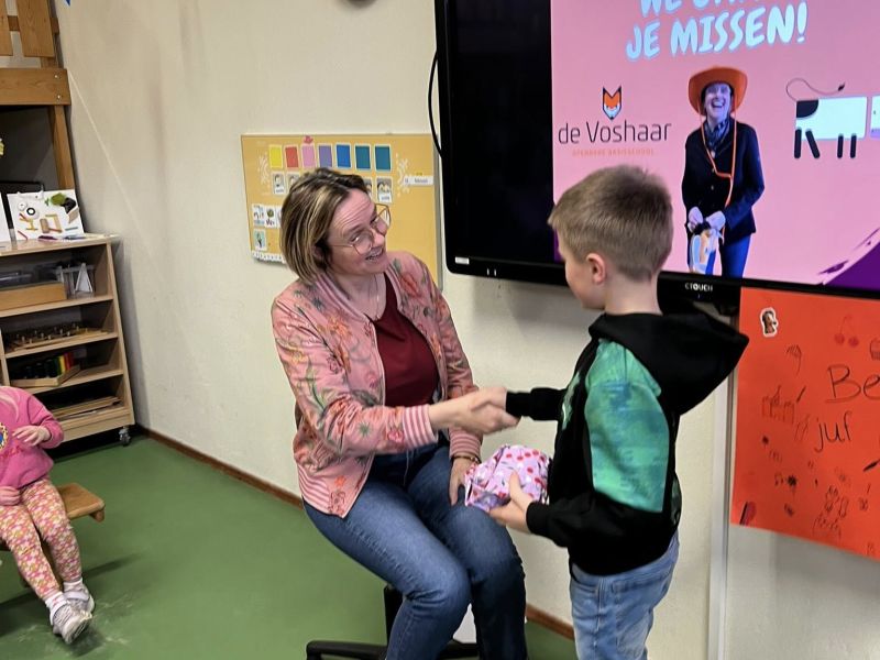 We gaan juf Marjan enorm missen. Gelukkig laat ze een blijvende herinnering achter — haar enthousiaste optreden bij Voshaar Got Talent op een hobbyhorse. In datzelfde thema hebben wij een speciaal afscheidscadeautje geregeld: een echte hobbyfox.